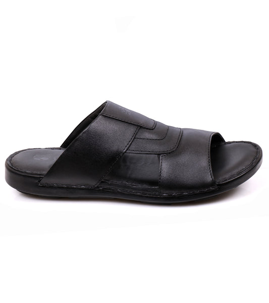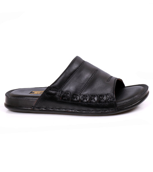 Sleek black cow leather slippers with durable PU sole and soft cushioned interior. Comfortable for home or casual use, combining elegance with long-lasting wear.- Rs.3,299