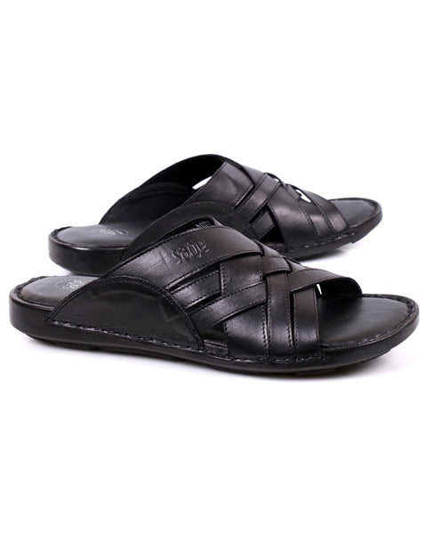 Classic black & brown cow leather slippers with soft sheet sole, cushioned leather lining, and ergonomic inner sole. Perfect for indoor comfort or casual wear, combining durability and sophisticated style.- Rs.4,699