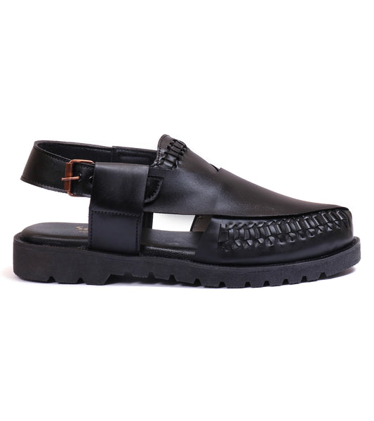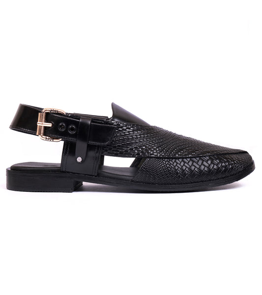 Premium black leather Peshawari chappal offering timeless style and unmatched comfort. Handcrafted from cow leather with PU sole, perfect for formal and casual wear.- Rs.3,500