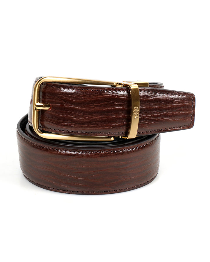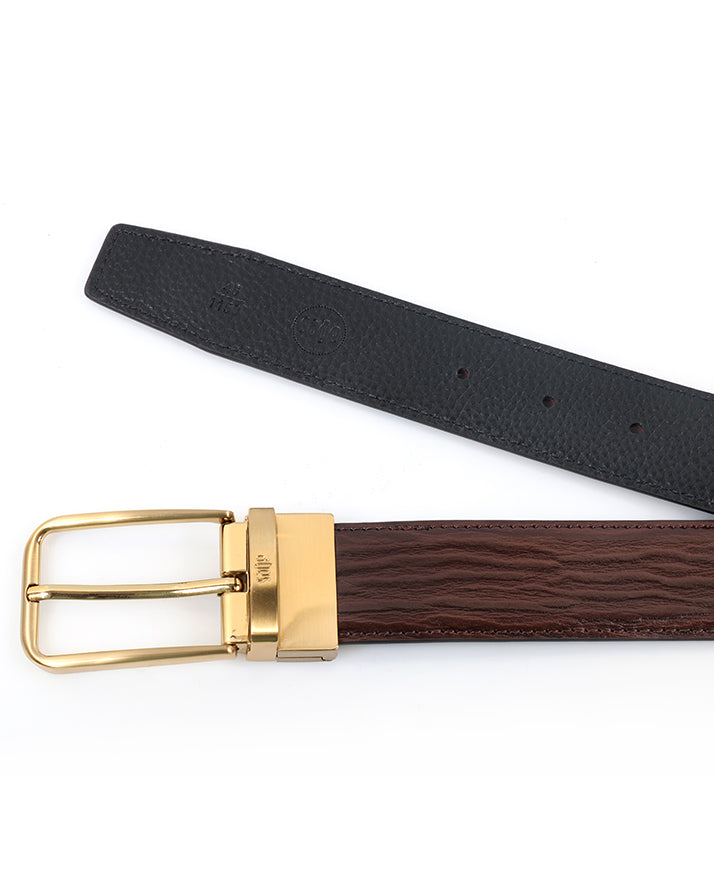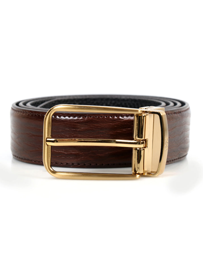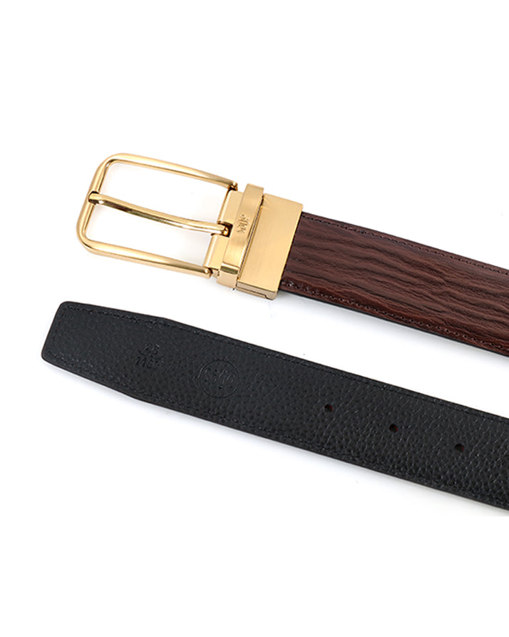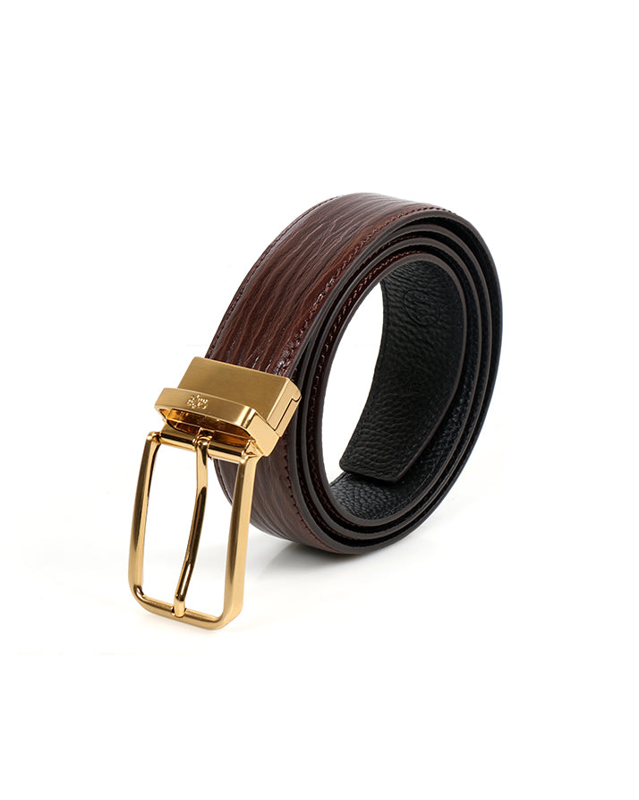 Printed-style double-sided leather belt in brown and black. Built with a strong buckle and adjustable for daily comfort. A versatile accessory to complement both formal and casual attire.
