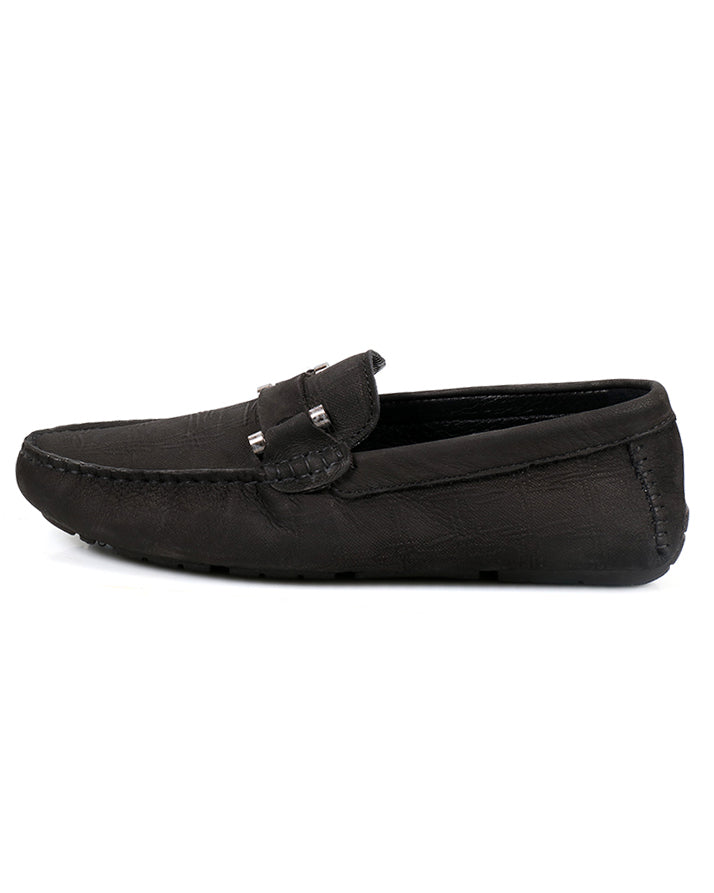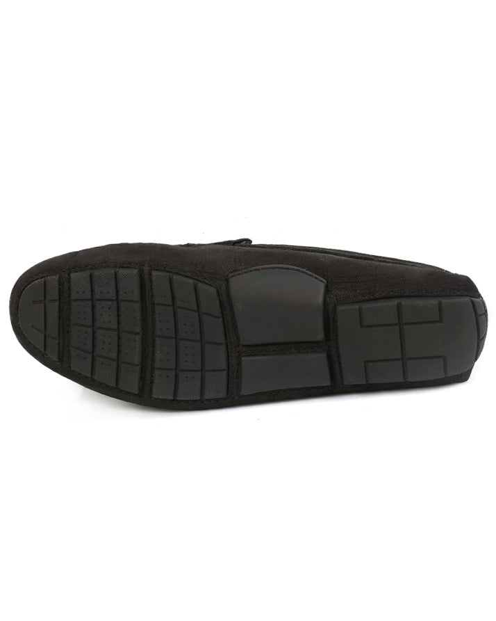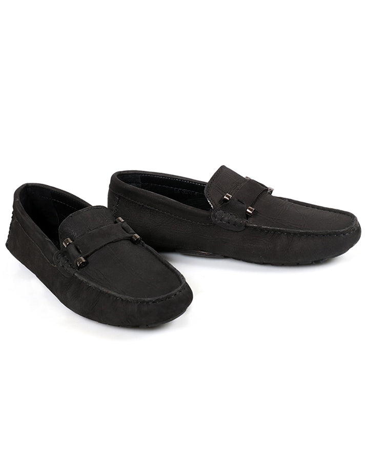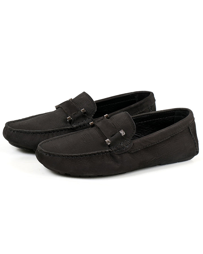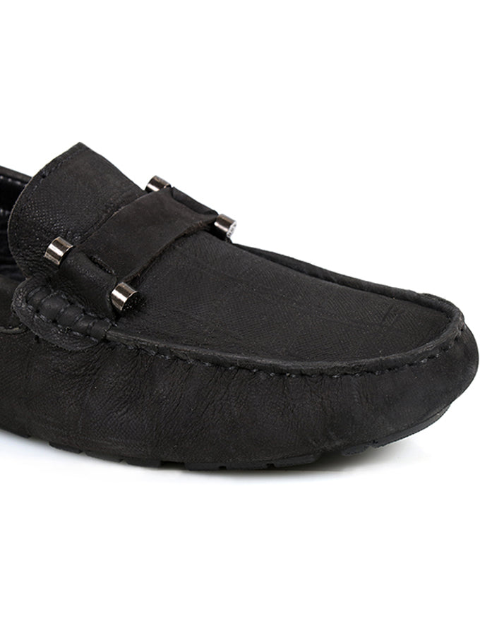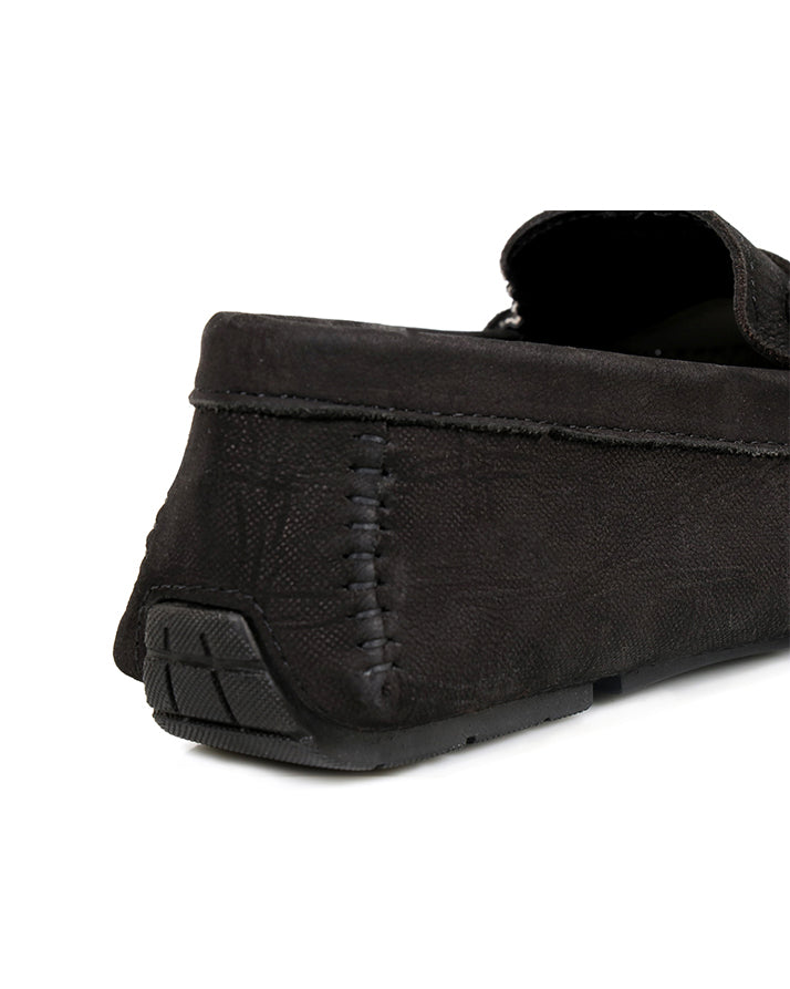 Black nubuck leather loafers with a refined embossed design. Built with a sturdy PVC sole, leather lining, and cushioned inner sole. A durable, stylish, and comfortable choice for daily casual wear.
