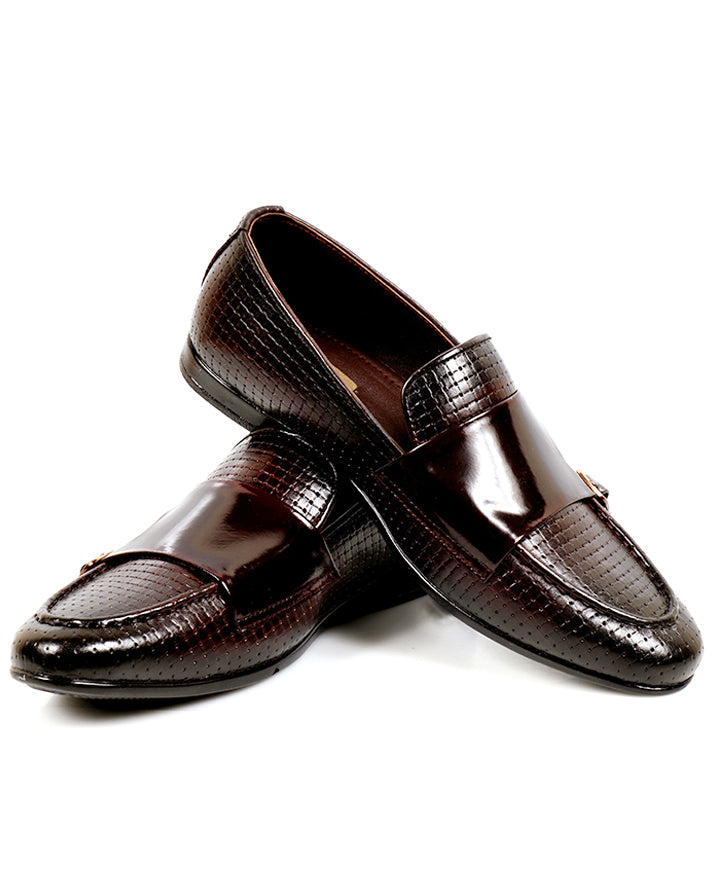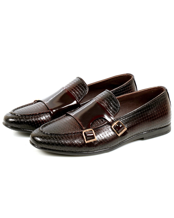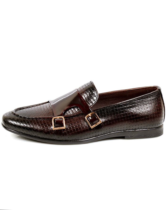 Coffee-colored double monk strap shoes crafted from cow leather with a sheet sole. Leather lining and cushioned socks enhance comfort, while the elegant design adds sophistication. A stylish pick for formal and smart-casual attire.