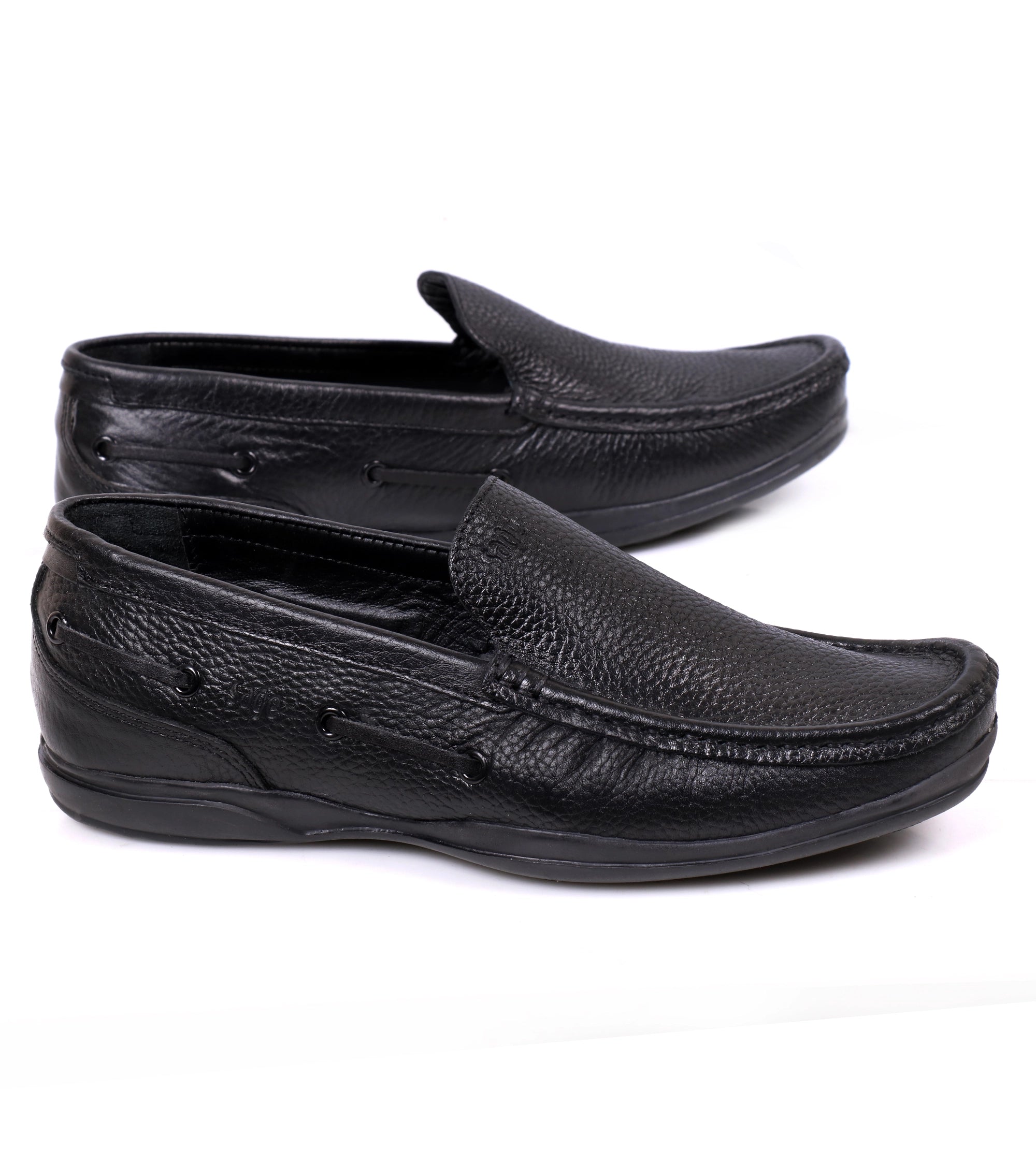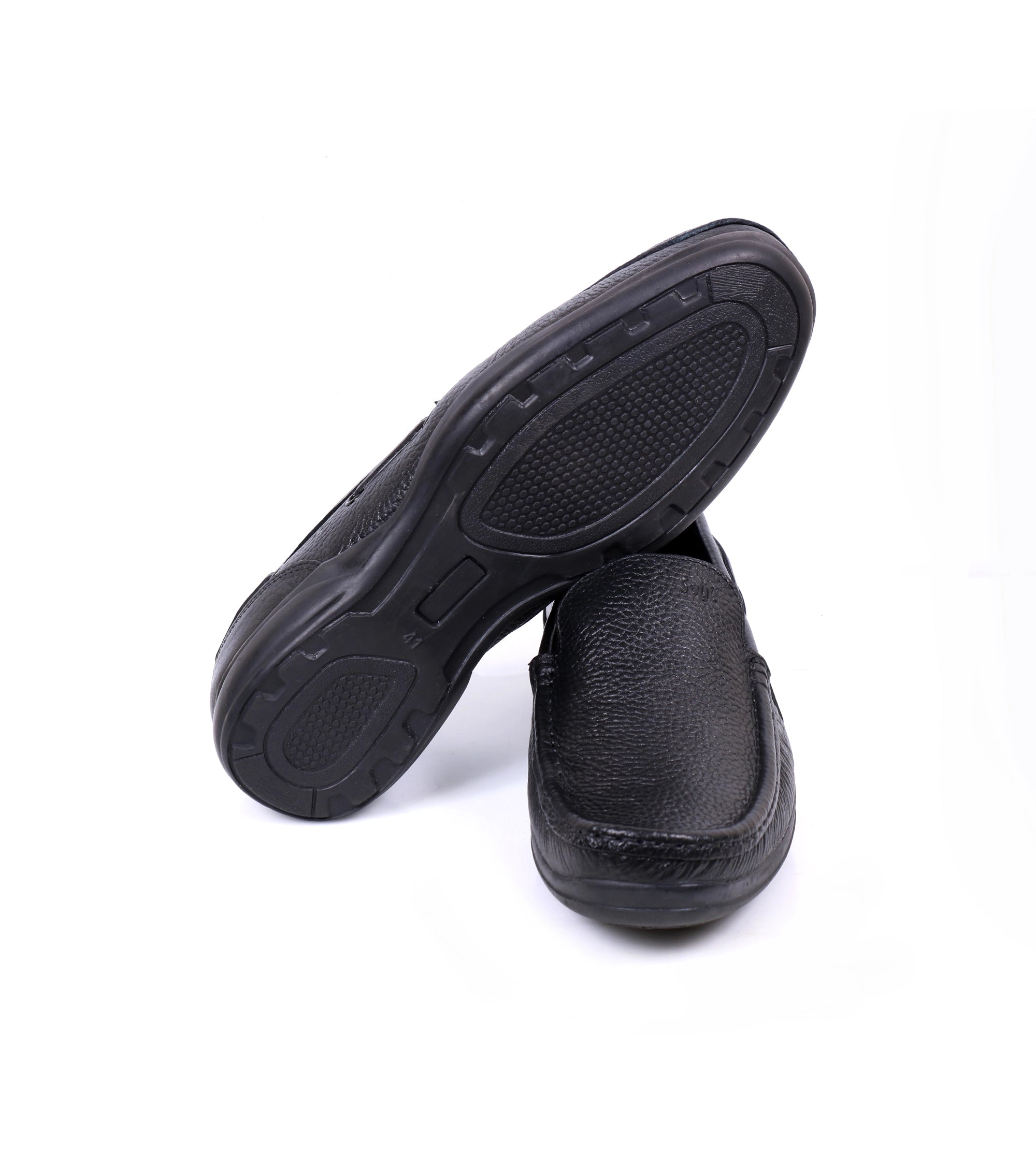 These black loafer-style shoes are crafted from milled cow leather with a durable rubber sole. Designed with leather lining and cushioned inner sole, they combine elegance with comfort. A versatile choice for casual and semi-formal wear.