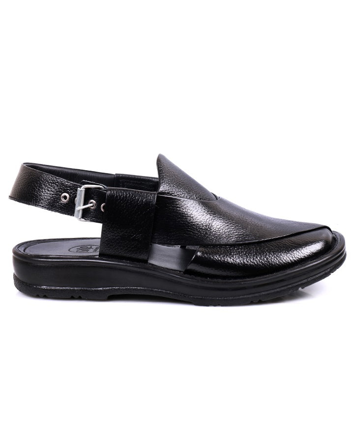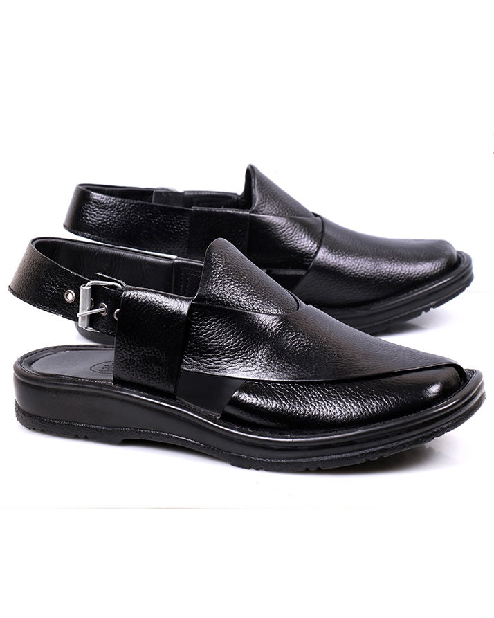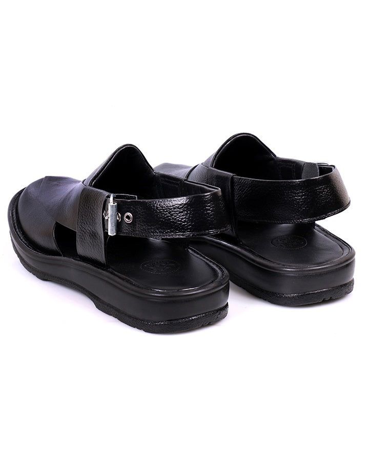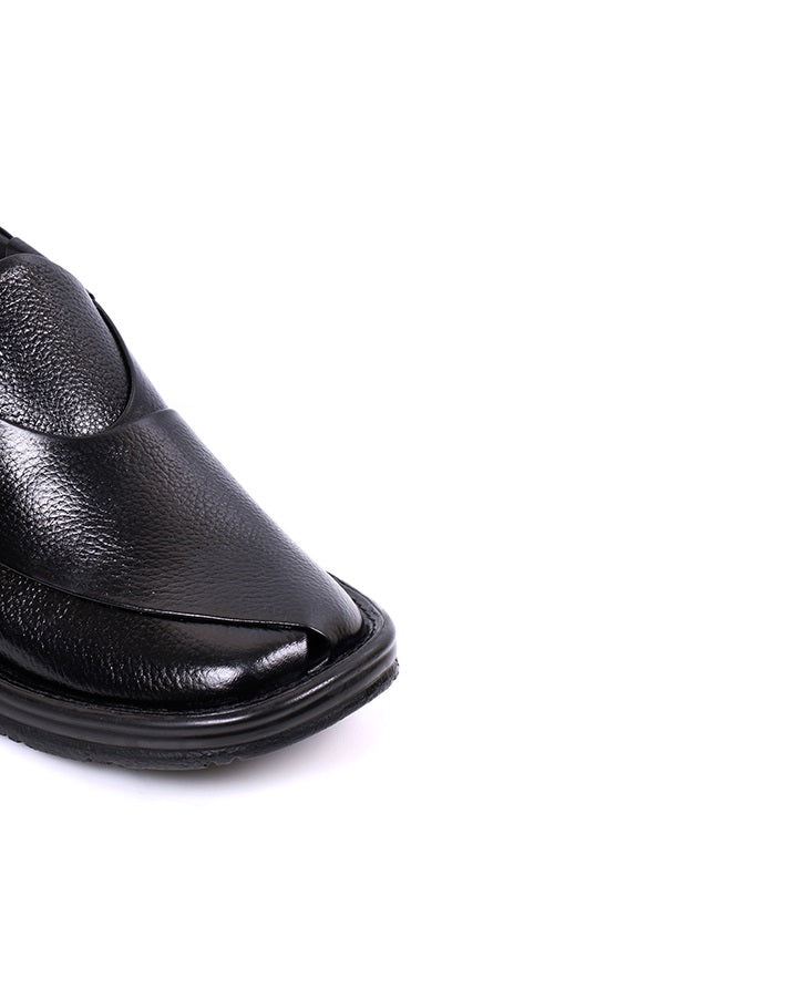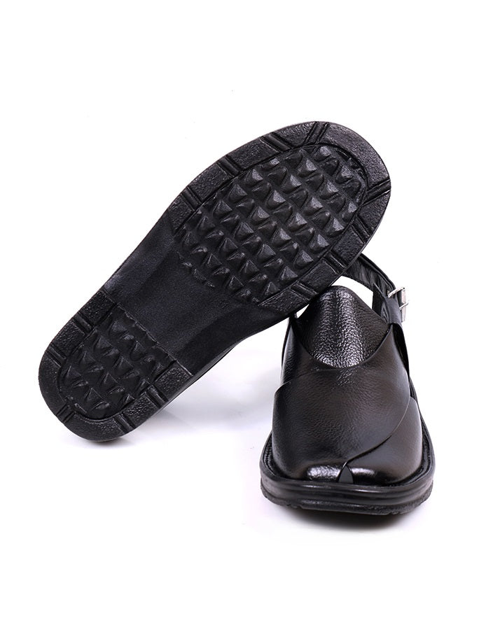 Stylish black chapal made from premium cow leather with soft PU sole. Lightweight yet durable, offering a blend of elegance, comfort, and versatility.