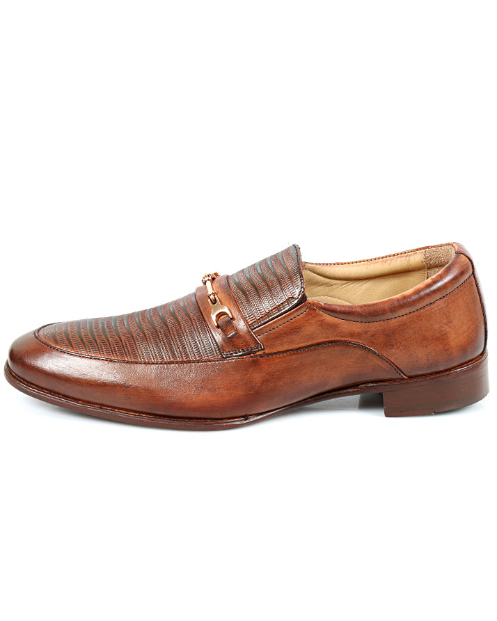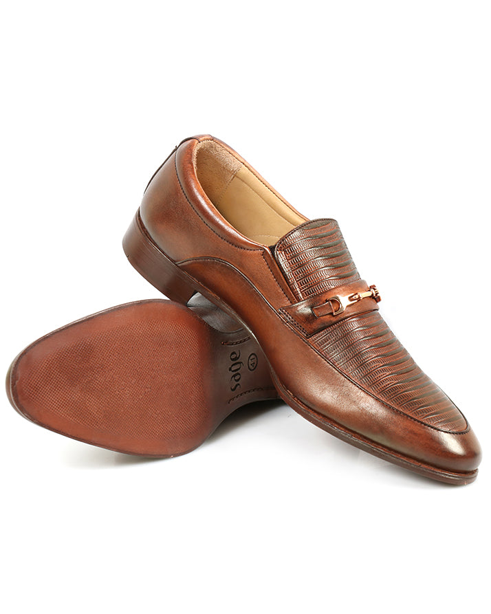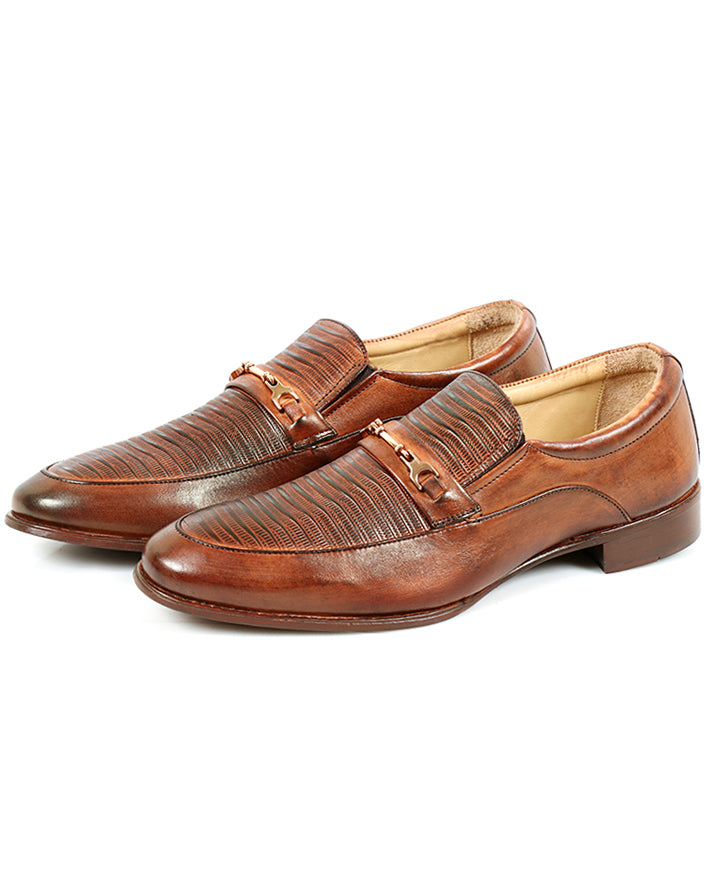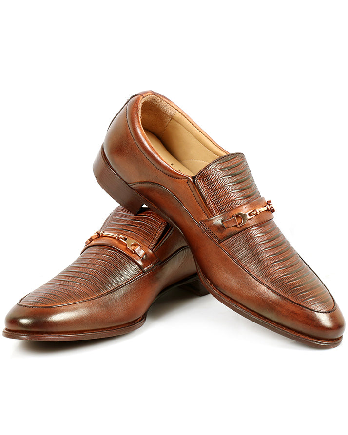 Upgrade your formal wardrobe with these brown slip-on shoes made from genuine cow leather. Featuring plain and printed detailing with a leather sole, they combine durability with elegance. Perfect for office wear and formal occasions.