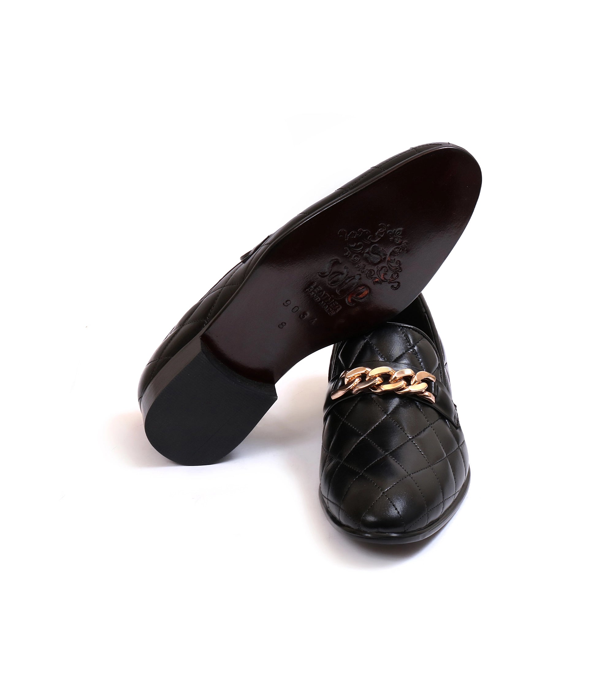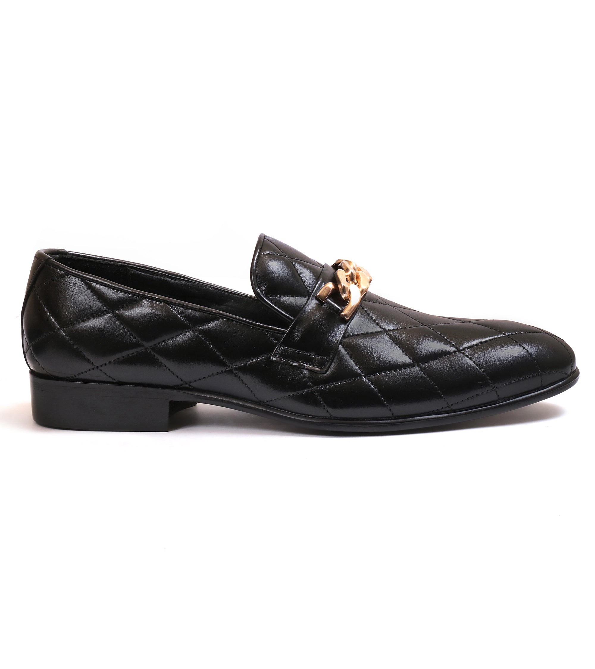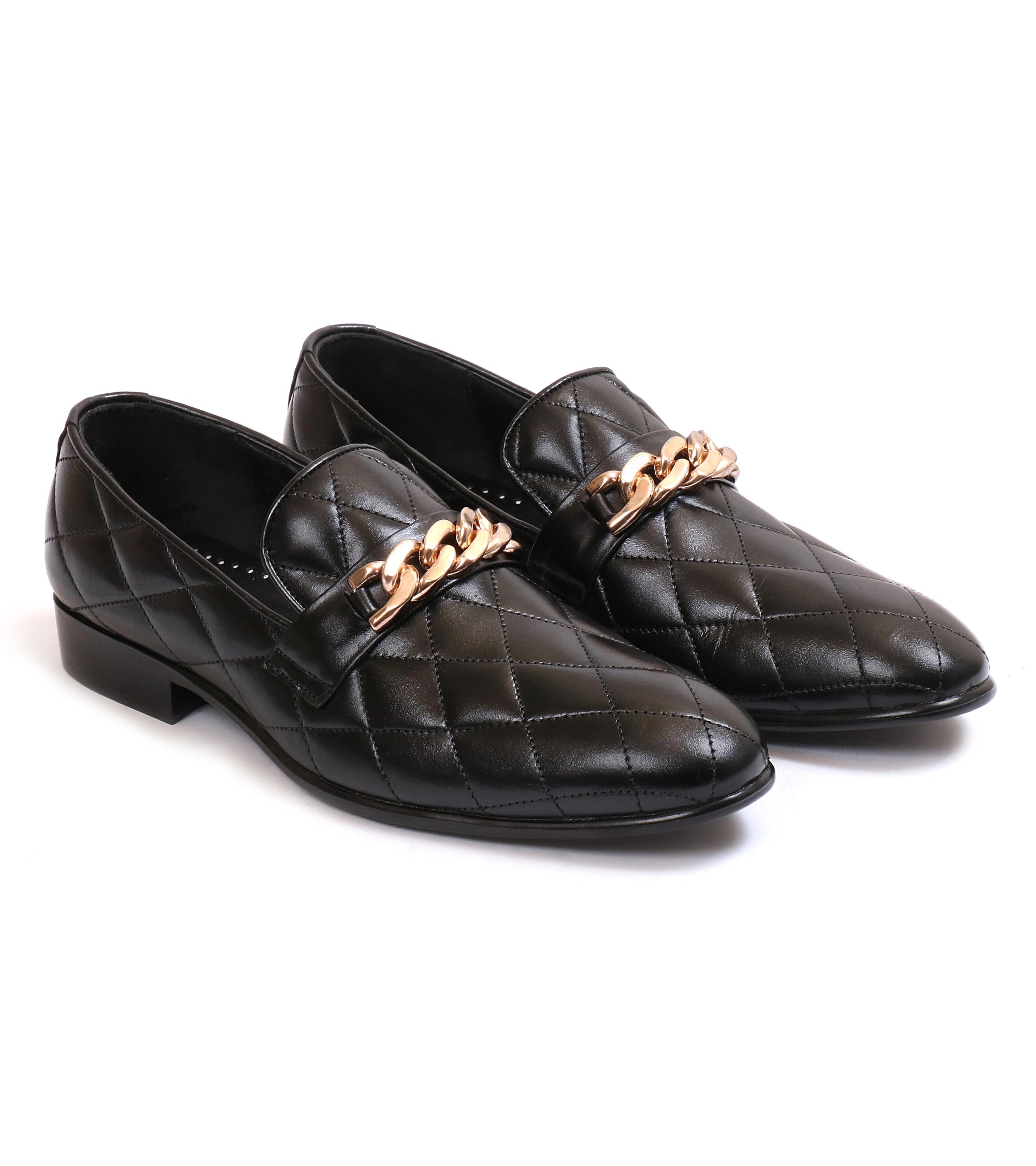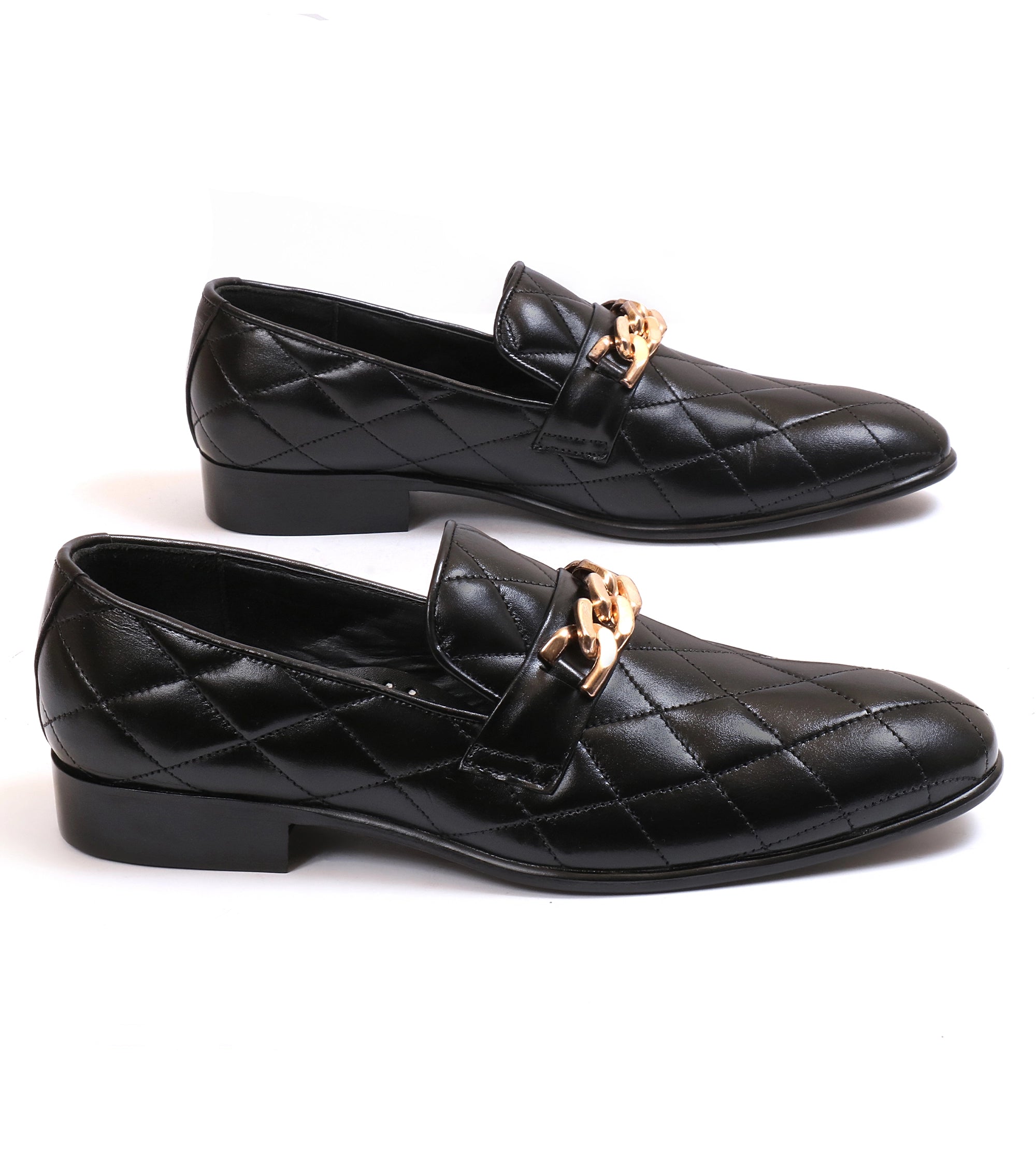 These black slip-on shoes feature a printed cow leather design for a unique edge. Built with a durable leather sole and lining, they provide comfort and long-lasting wear. A stylish addition to any formal wardrobe.
