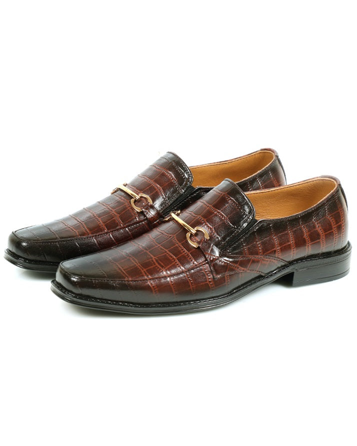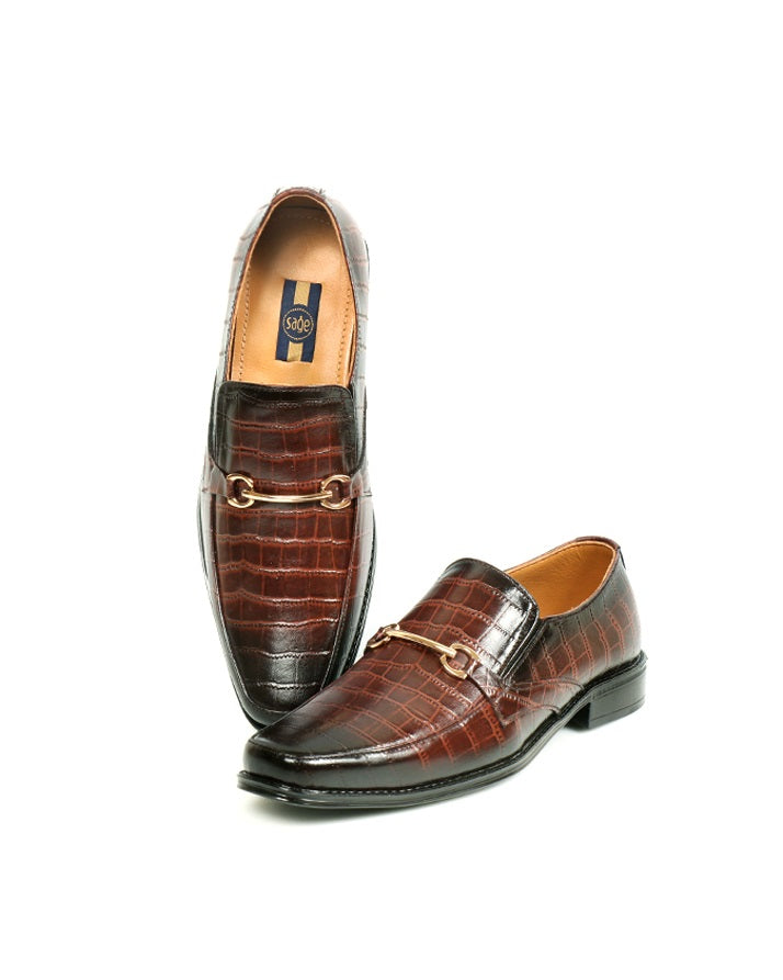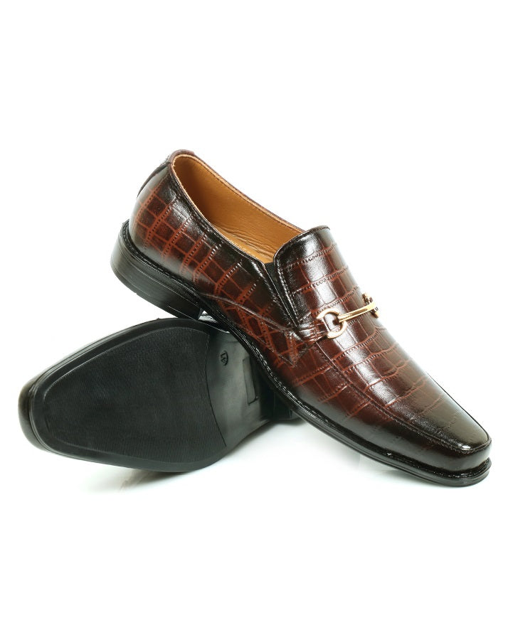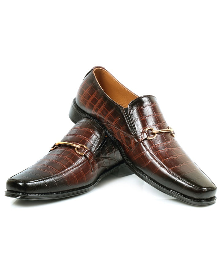 Add sophistication to your look with these brown crocodile-style slip-on shoes. Crafted from premium cow leather with a durable rubber sole, they offer lasting comfort. A perfect choice for formal wear with a touch of luxury.