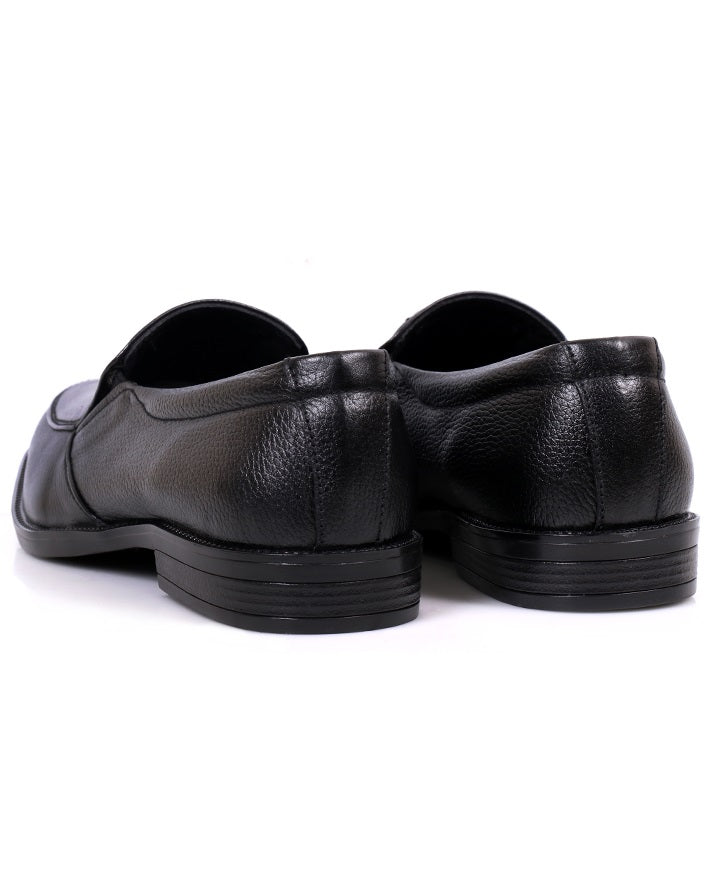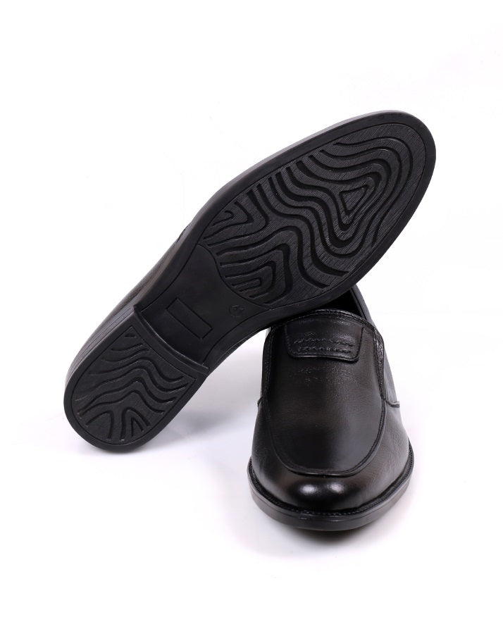 Crafted from plain cow leather, these black slip-ons are a staple for formal wardrobes. With a rubber sole and leather lining, they ensure durability and comfort. A sleek, classic shoe perfect for business or formal events.