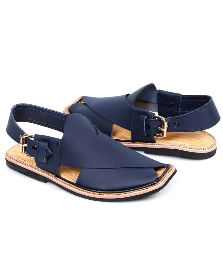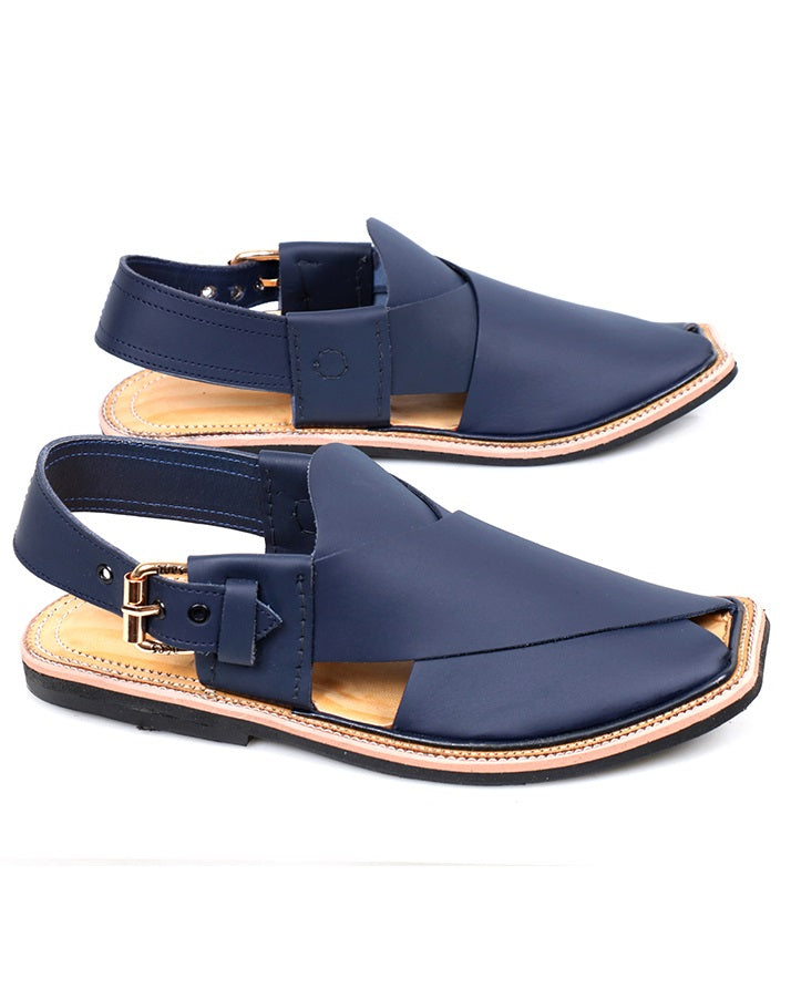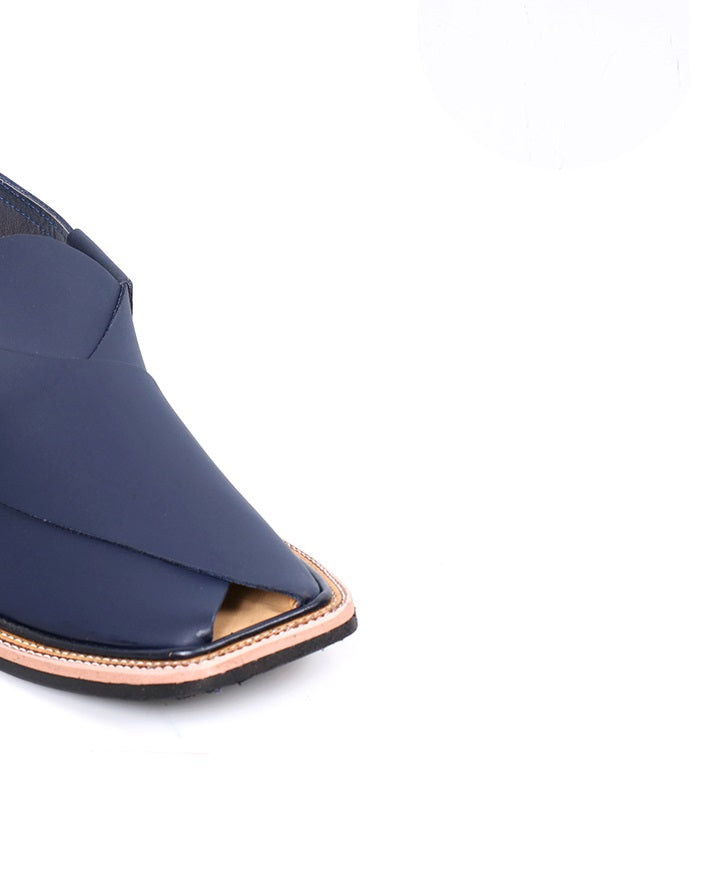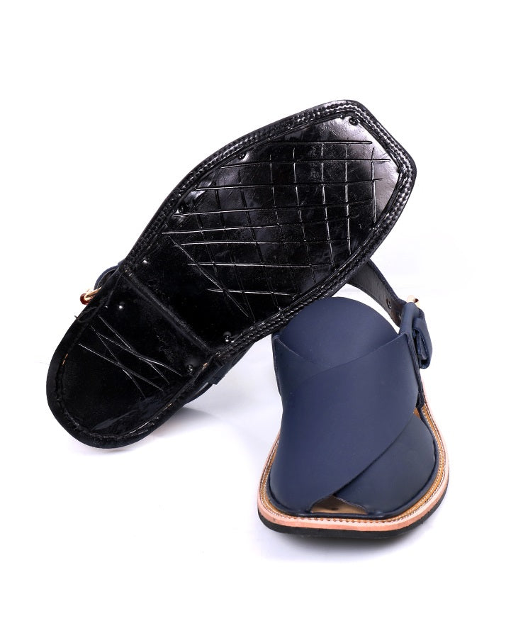 These blue and black traditional Charsadda shoes feature plain leather, tire sole durability, and soft comfort. A timeless design ideal for cultural wear and everyday sophistication.