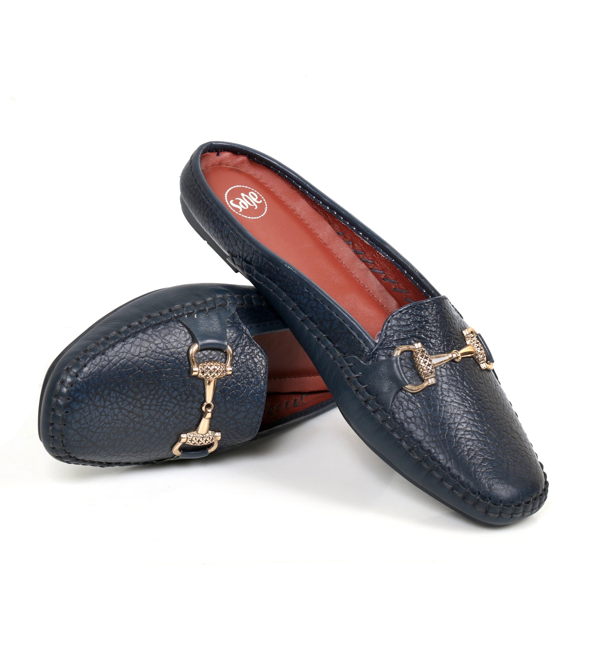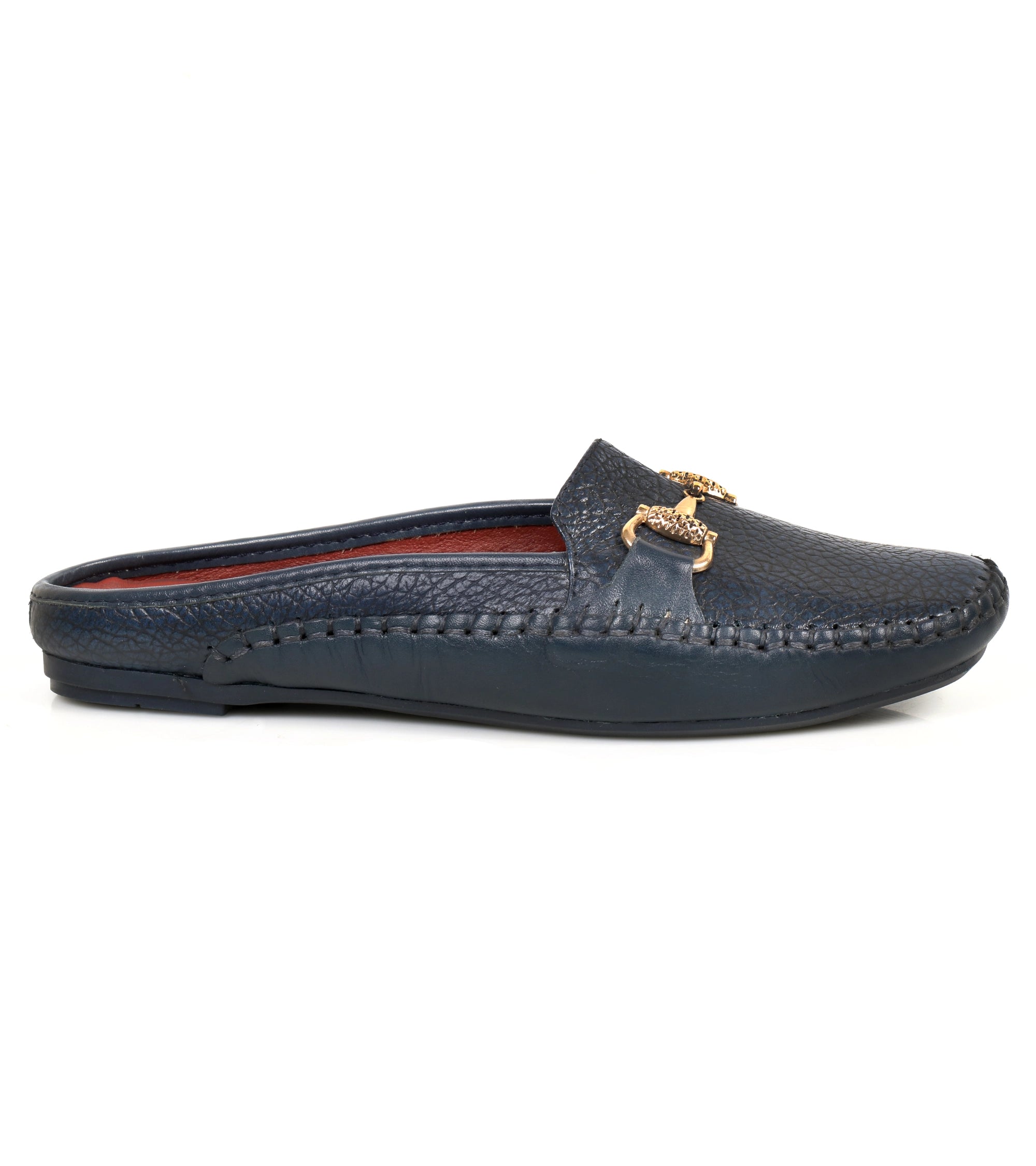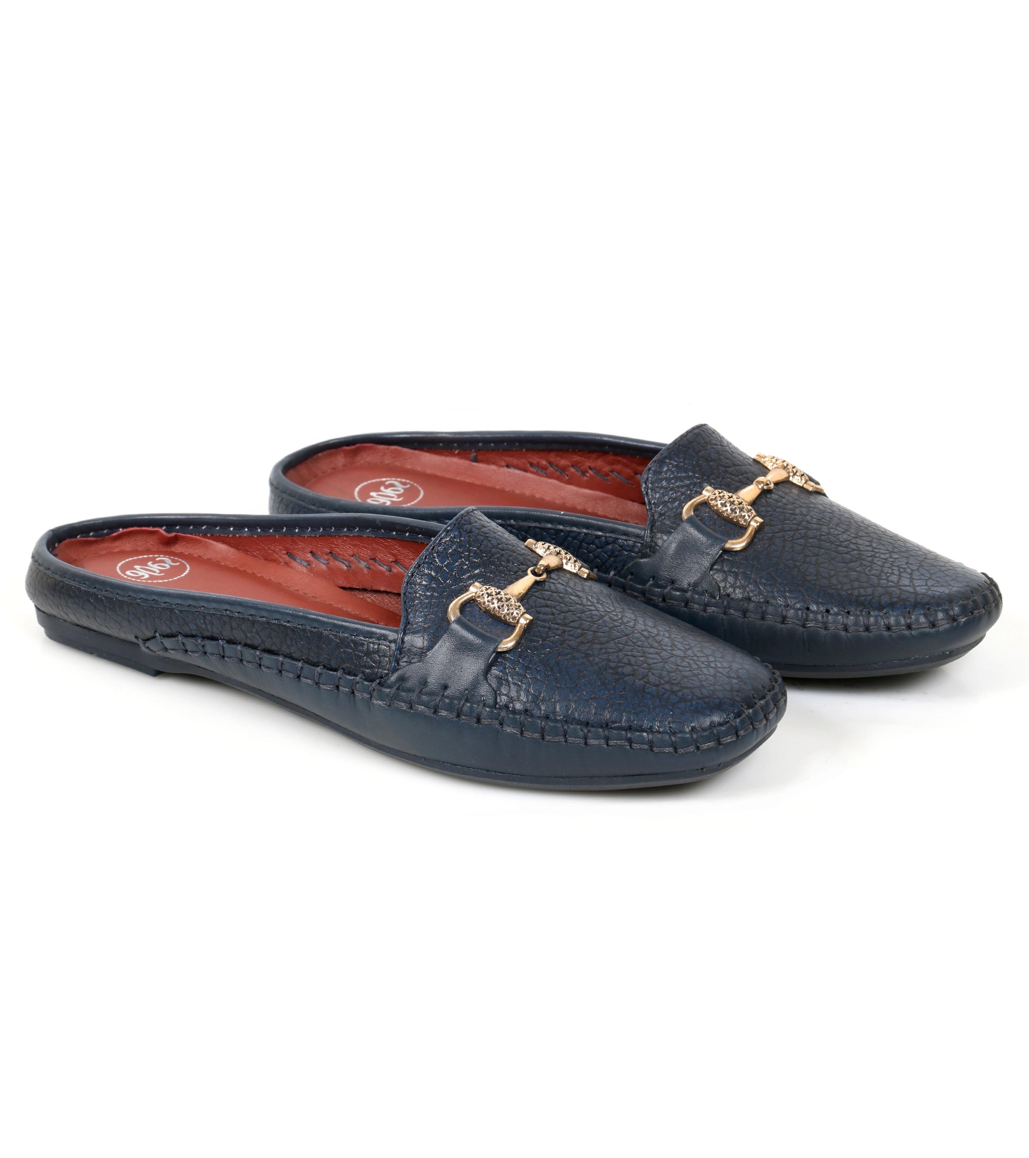 Stylish blue backless cow milled leather shoes for women. Designed for all-day comfort with a cushioned sole and classic elegance for casual or semi-formal wear.