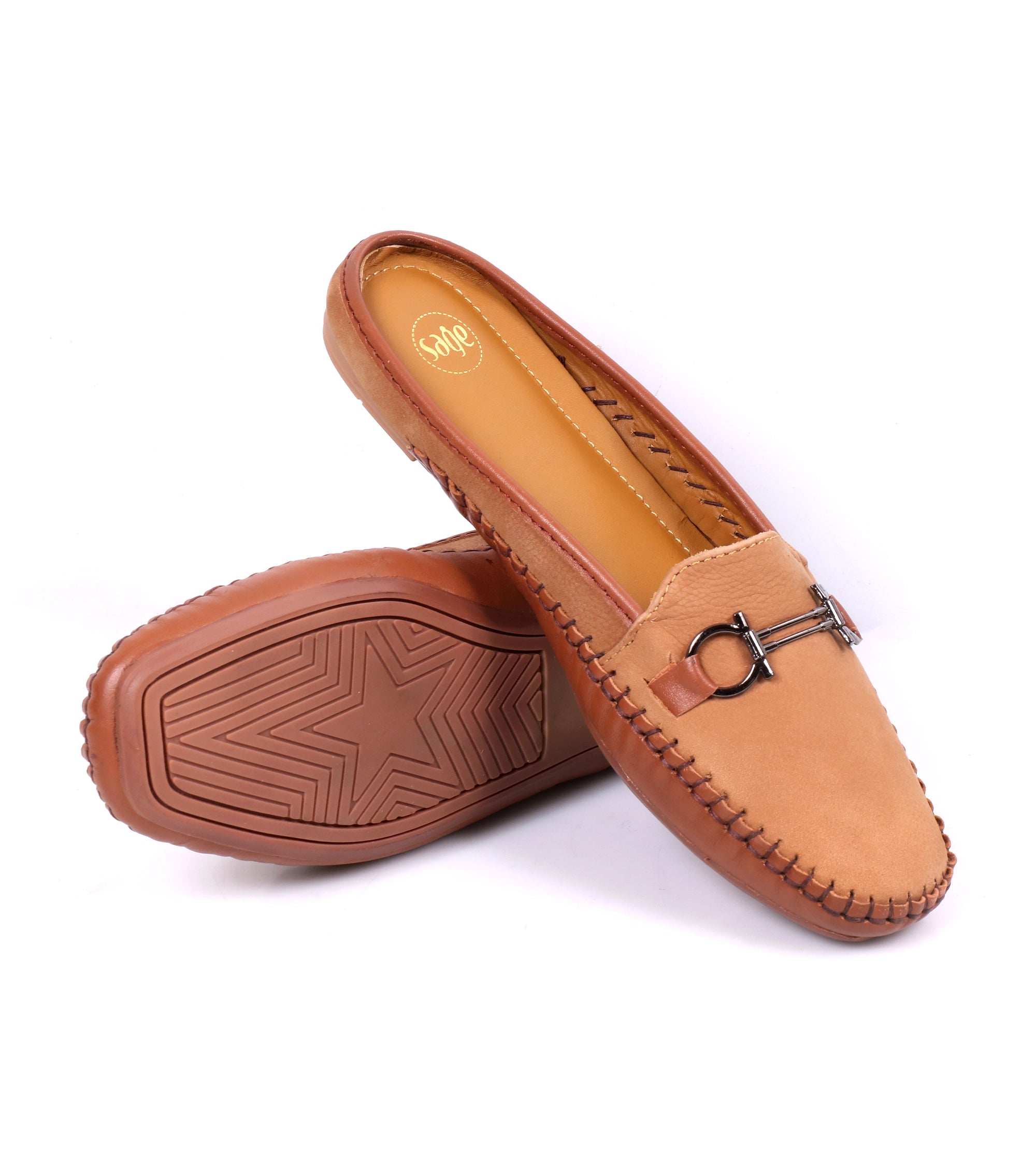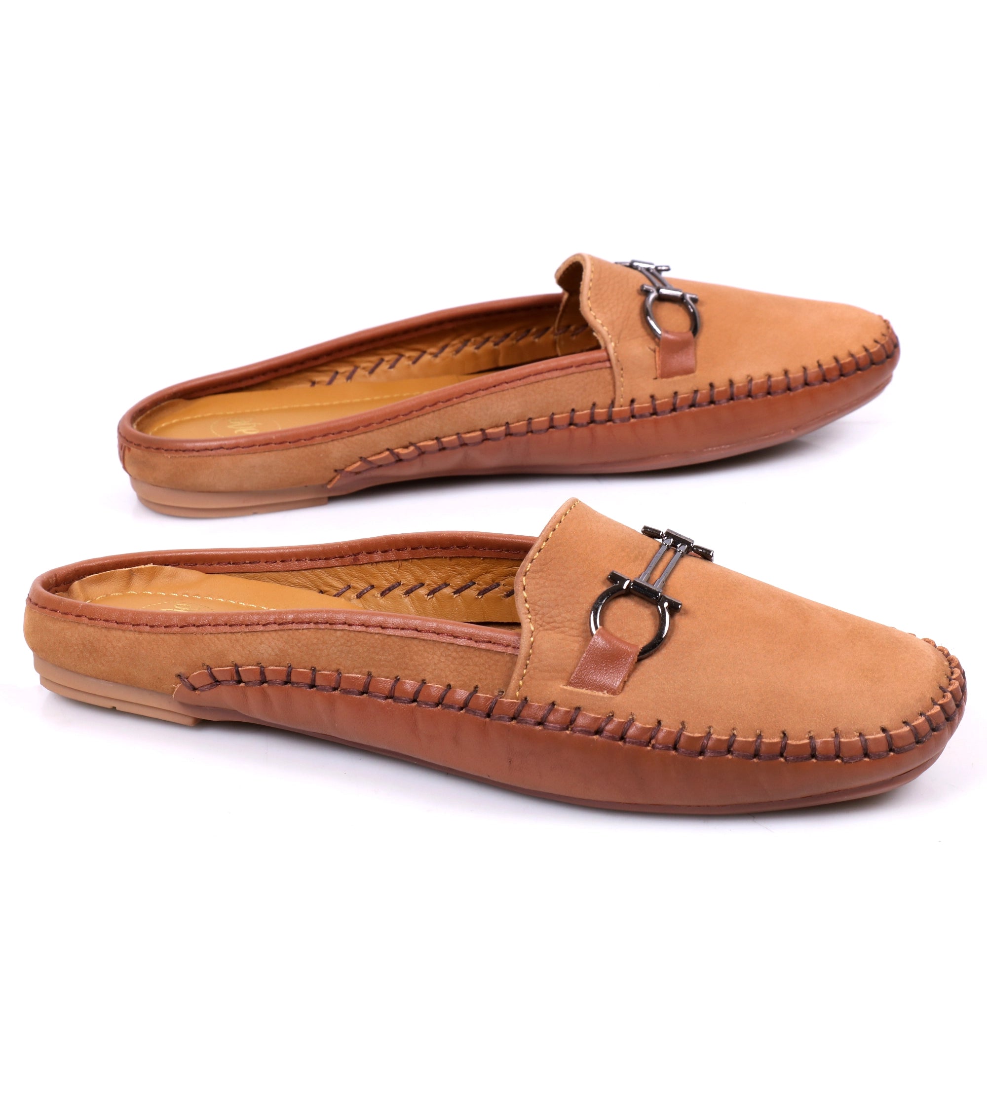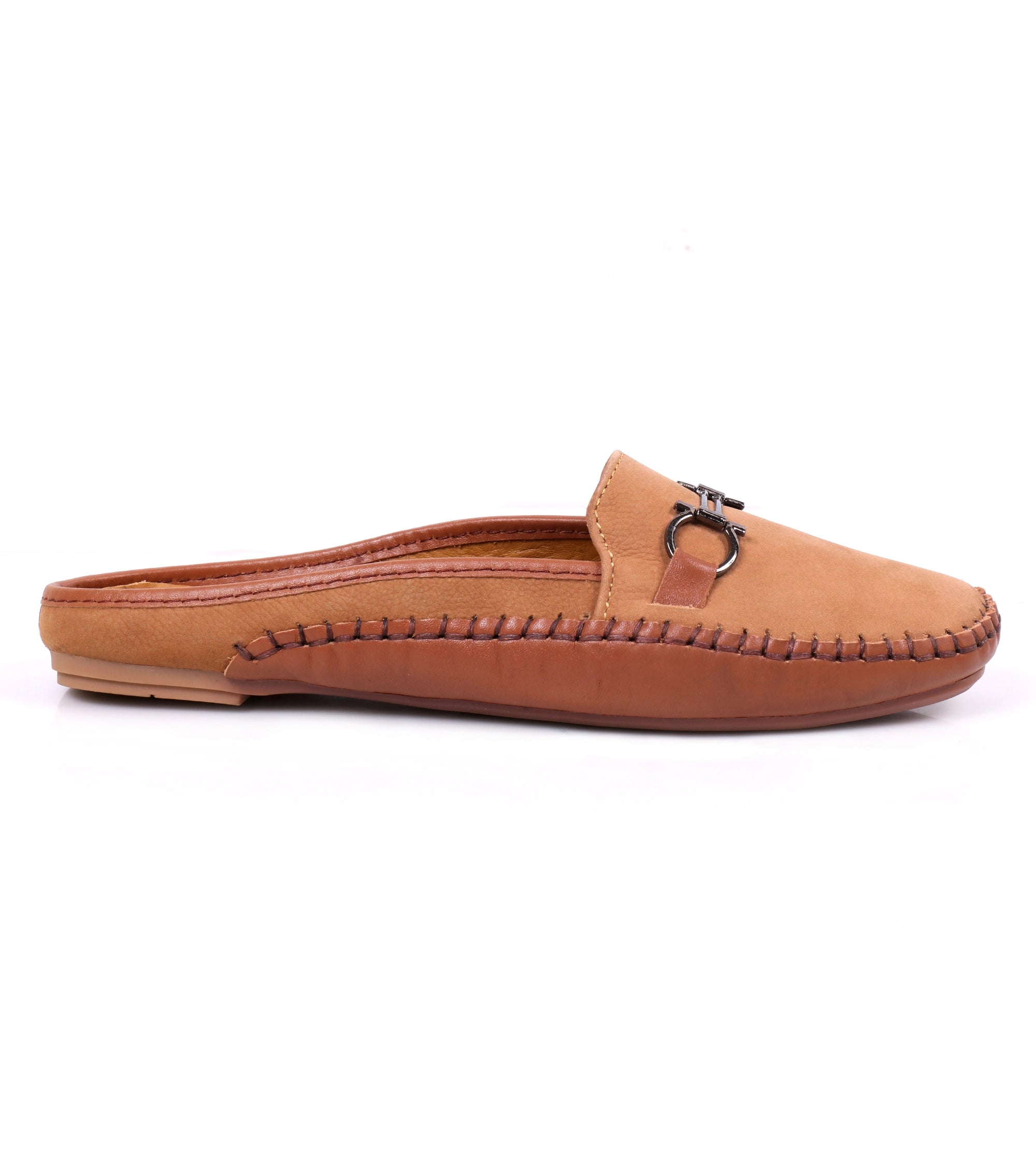 Tan backless plain cow leather shoes with a classic design. Comfortable, durable, and perfect for casual outings...
