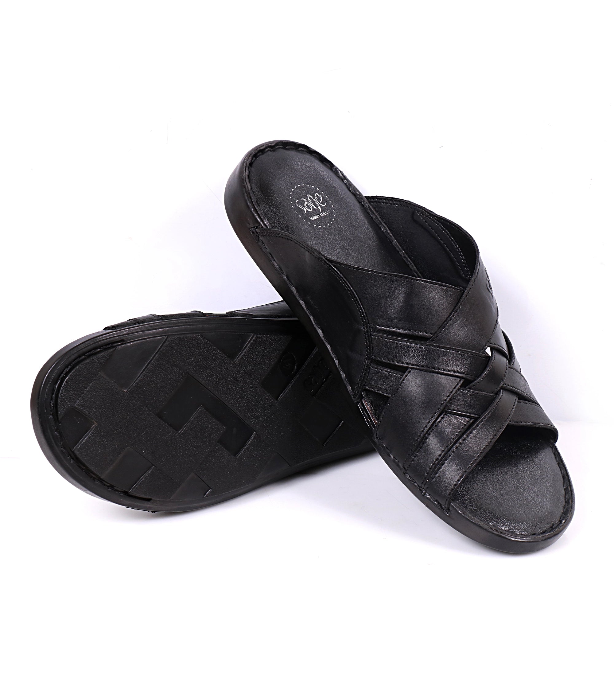 Classic black & brown cow leather slippers with soft sheet sole, cushioned leather lining, and ergonomic inner sole. Perfect for indoor comfort or casual wear, combining durability and sophisticated style.