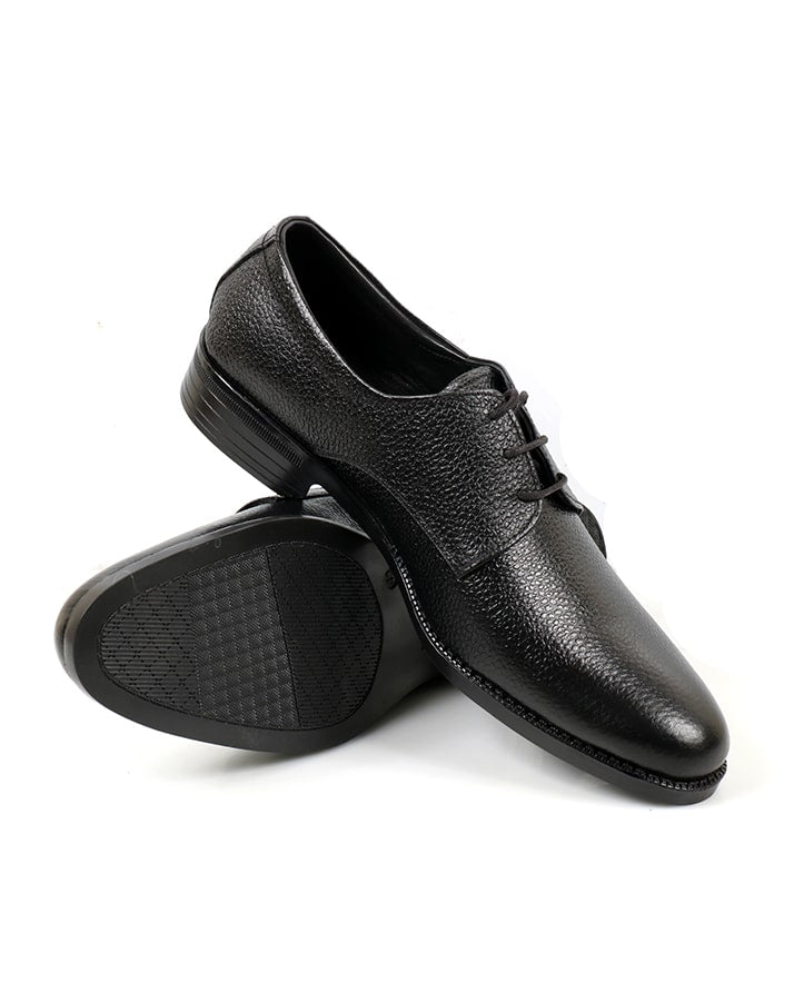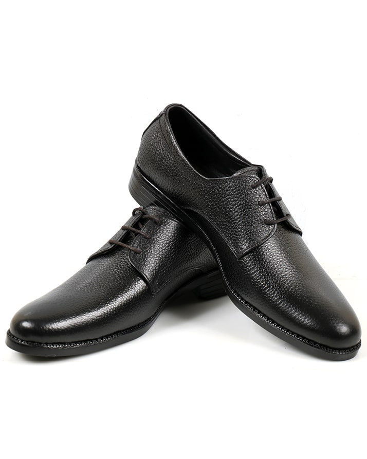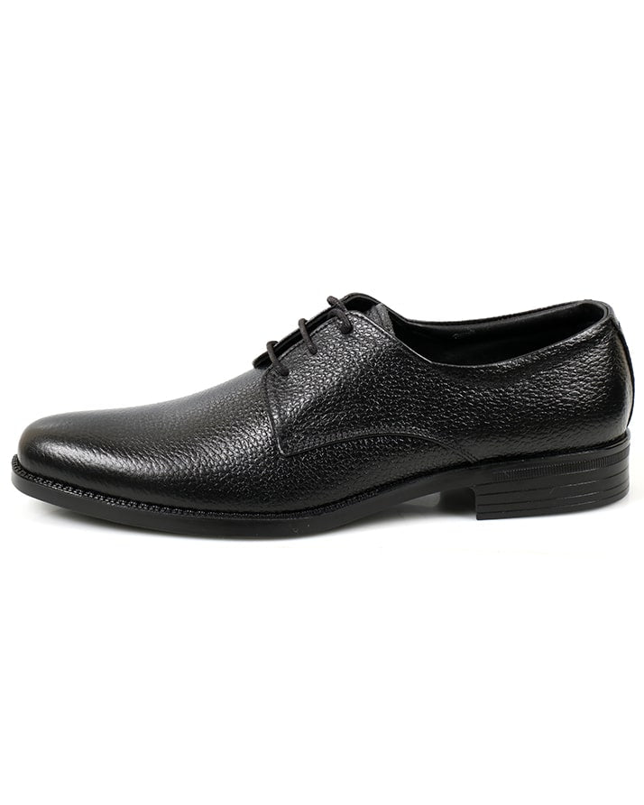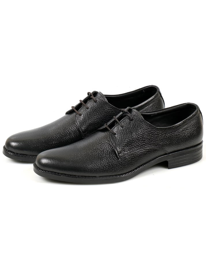 Black lace-up formal shoes made from milled cow leather with a rubber sole for comfort. Elegant and durable, ideal for professional and semi-formal occasions.