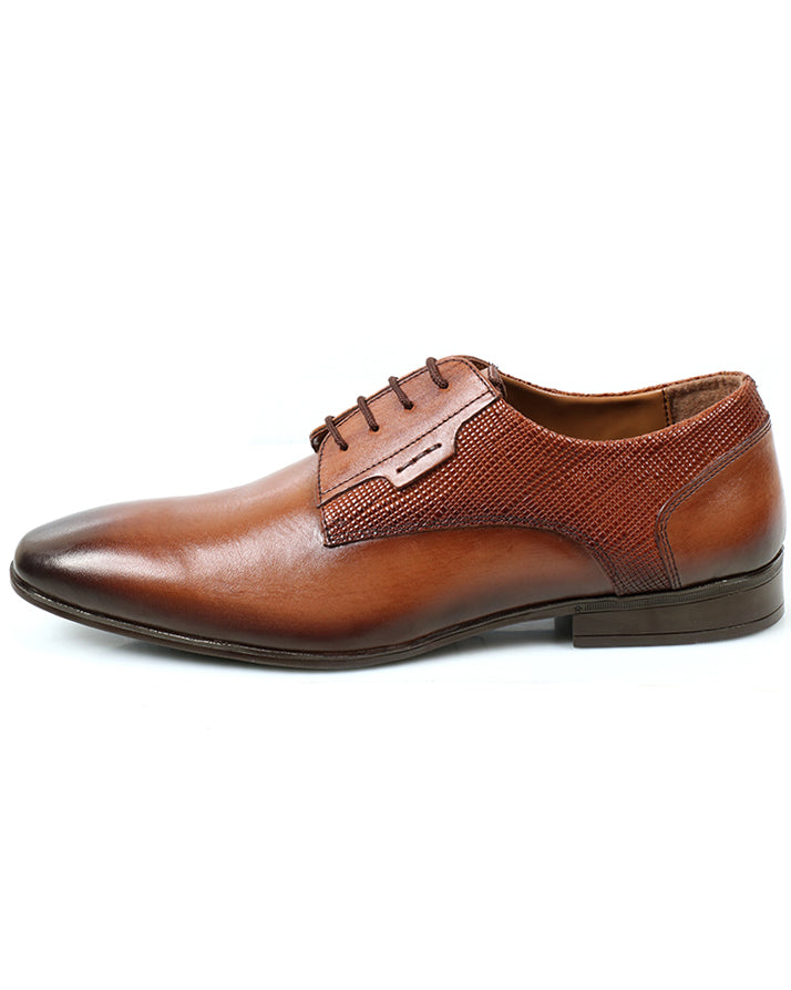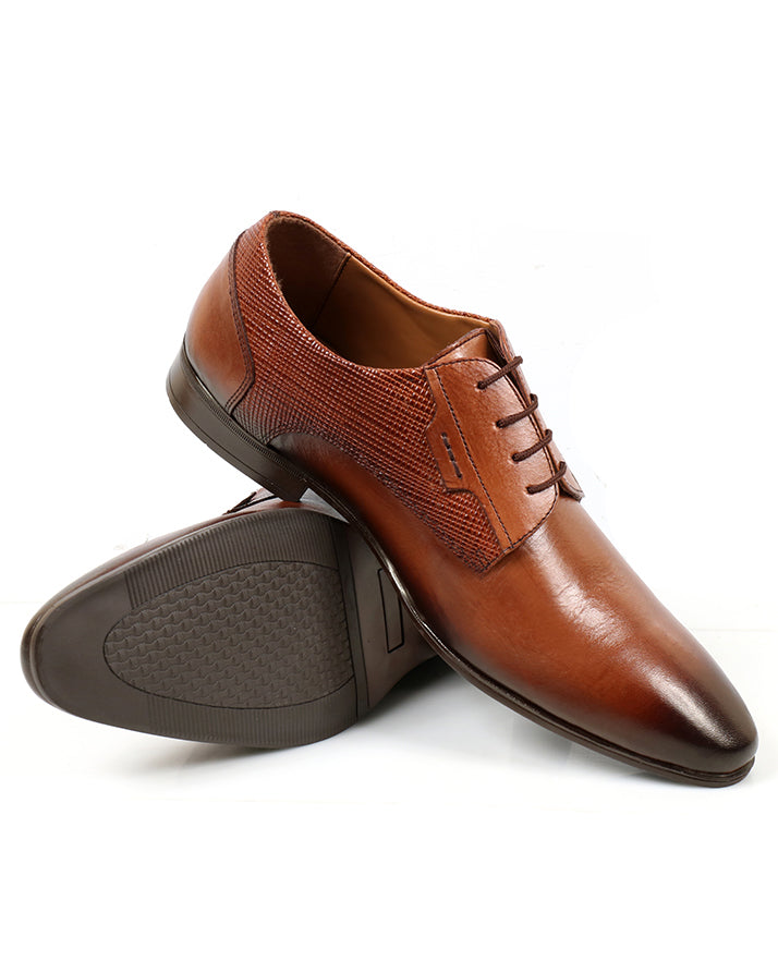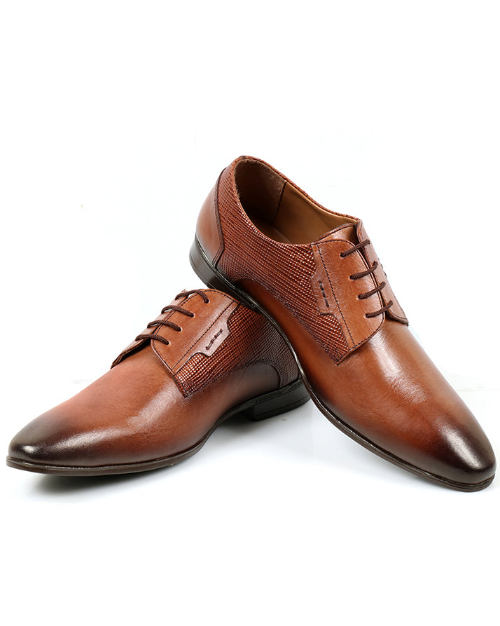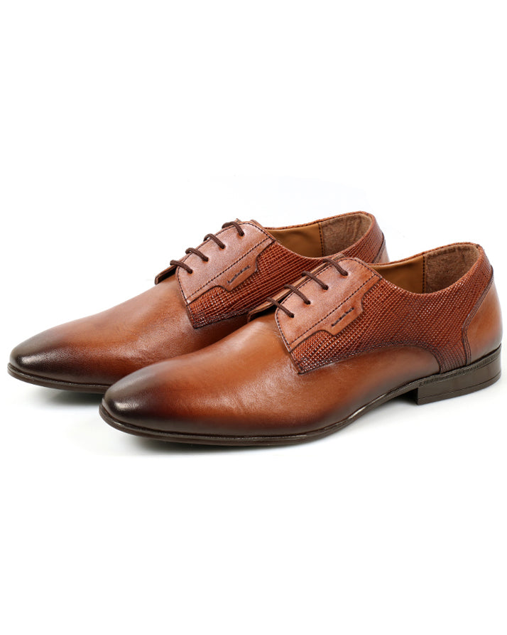 Brown lace-up casual shoes combining plain and printed cow leather. Comfortable and durable with a rubber sole, perfect for versatile everyday wear.